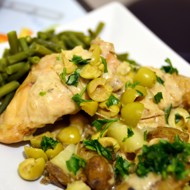 Remove the cooked rabbit from the sauce, arrange it on serving plates, drizzle with the white sauce, place the potatoes and green beans alongside, and sprinkle with coarsely chopped olives and parsley.
