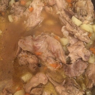 Cut the rabbit into portion-sized pieces. Sauté in a pan until browned. Transfer to a stewing pot.