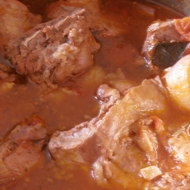 Heat the oil in a large pot over medium heat. Sprinkle the rabbit with salt and pepper. Place it in the pot and fry until golden brown. If the pot is small and all the pieces do not fit, fry in batches. Remove from the pot.