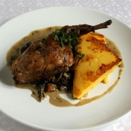 To serve, place a couple of fried polenta triangles on a plate next to a rabbit leg with mushrooms. Sprinkle with chopped parsley.