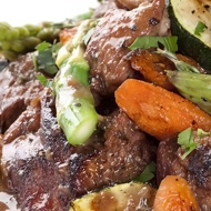 Add the carrot, potato, and zucchini to the skillet with the rabbit, season with salt and pepper to taste. Cook for another 10 minutes, then add the asparagus.