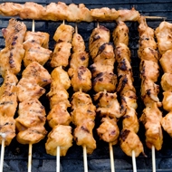 Cut the meat into 3x3 cm pieces and thread them onto a skewer, alternating between veal and pork, with 6 pieces on each skewer. An electric grill can be used.