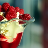 Raspberry and Rhubarb Sundae with Whipped Cream and Walnuts