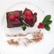 Cover with the remaining chocolate batter, take a wooden skewer, and swirl it through the batter in random directions to create a marbled effect. Place the raspberries on top and gently press them into the batter.