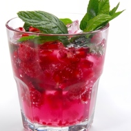In a pitcher, mix the sparkling water, frozen raspberries, mint sprigs, and liqueur.