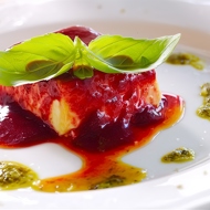 Garnish the set panna cotta with berry jam and a mint leaf. Serve immediately.