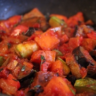 Add the chopped peppers and sauté, stirring, for another five to seven minutes until the peppers are soft enough to be easily crushed with a wooden spatula. Season with salt and pepper, mix in the chopped parsley, and remove from heat. Slice the eggplants, zucchini, squash, and the remaining three tomatoes into rounds. Pour a little pepper-tomato sauce into the bottom of a deep baking dish and layer the vegetable rounds, alternating eggplants with tomatoes and zucchini. Drizzle a layer of sauce on top and add another layer of rounds. Continue this until all the vegetables are used and the sauce is finished. Seal the baking dish with foil.