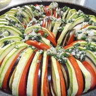 Layer the eggplant, tomatoes, and zucchini alternately.