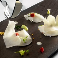 When serving, garnish the dish with yogurt and rice chips, avocado mousse, rings of spring onion, edible flower pollen, and beetroot chips.