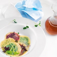 Place the filling in the center of the square wonton wrapper (all ravioli should have different fillings), brush the edges with egg, top with a second square and seal the dough. Repeat this with all the dough and filling. Then, use a culinary ring or a cup to shape everything into round ravioli.