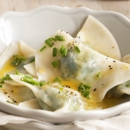Place small mounds the size of a walnut evenly spaced on one sheet of dough. Moisten the spaces between them with water using a brush. Cover with the second sheet of dough, pressing it tightly between the mounds of filling. Carefully cut the dough between the rows of filling and press the edges of each resulting square of dough. Let the ravioli dry for 10 minutes, then drop them into a pot of boiling salted water.