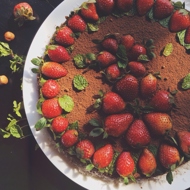 Sprinkle it with the remaining cocoa, decorate with fruits and berries (the larger and denser, the better), and mint.