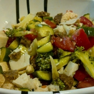 Cut the broccoli and cauliflower into not very small florets (you should have a handful of chopped florets) and add them to the vegetables in the bowl.