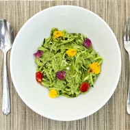 Raw zucchini pasta with spinach and sunflower seed pesto