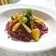 Serve the barley on individual plates, garnished with yellow beetroot and celery, and herbs.