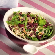 Combine the cooked beans (canned is fine) with finely chopped red onion, arugula, crushed garlic, olive oil, lemon juice, and flaked tuna.