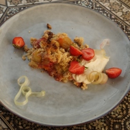 Arrange the rhubarb and strawberries in a dish. Sprinkle with crumbs. Top with a tablespoon of sugar for a caramel crust. Bake in the oven for 25 minutes.