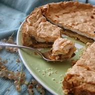 Beat the egg whites with powdered sugar until stiff peaks form. Remove the pie from the oven, spread the egg whites on top, and bake for another 20–25 minutes at 320°F. Allow the finished pie to cool completely.