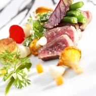 For the ribeye, generously season the beef with freshly ground pepper and Gerande salt flowers, and sear it on all sides in a hot skillet with olive oil. Once cooked, slice the meat into thin pieces.
