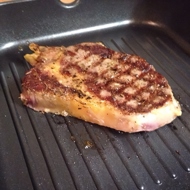 Rub the steak with olive oil, and season with salt and pepper. Preheat a grill pan to high heat and sear the meat for 1.5–2 minutes on each side. If you prefer medium doneness, sear for an additional 3–4 minutes on each side. Place the meat on a rack and let it rest for about 5 minutes.