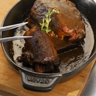 Remove the container and let the ribs cool—then carefully extract them so that the meat doesn’t separate from the bones. Strain the broth and reduce it by one third. If necessary, season with salt and pepper. Pour this sauce over the ribs and let them sit for two hours.