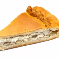 Divide the dough into 2 parts and roll out. Place one part in a greased baking dish, spread the filling, and cover with the second rolled-out piece. Pinch the edges. Brush the top of the pie with butter and sprinkle with grated cheese.