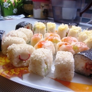 Now for the assembly. Soak a sheet of rice paper in warm water for 20 seconds, place it on a mat, and in the center, spread out the rice. Add any ingredients on top (cheese, I used cream cheese, peeled cucumber, crab stick, you can also add a folded lettuce leaf, or just cheese and caviar, or fish if you have it).