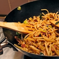 Wipe the pan with a paper towel and pour in more oil. Add the garlic. Sauté for literally 10 seconds, then add the vegetables one by one, starting with the hard ones. Stir-fry, constantly mixing, until the vegetables are almost cooked (they should still be crunchy).