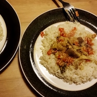 Cook the rice separately, place it on a large dish, make a hole in the center, and pour in the stewed mixture.
