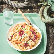 Now add the tentacles and shrimp. Fry for 1.5 minutes together with the rings.