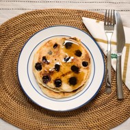Pour a small amount of batter onto the heated skillet, spread it out, and sprinkle with blueberries. Cook until golden brown, then flip and cook until done. Repeat the same with the remaining batter and berries.