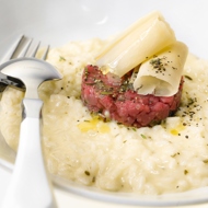 Carefully place the prepared tartare in the center of the plate (using a culinary ring works well), and surround it with risotto. You can garnish the dish with grated Parmesan, drizzle a bit of olive oil on top, and serve immediately.