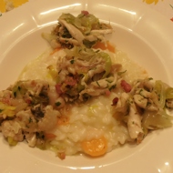 In a pan, fry diced bacon, 2 finely chopped shallots, garlic in its skin, slightly crushed, olive oil (30 g), and a bay leaf. After 3–4 minutes, add the leek in rings, onion, 2 sage leaves, and a sprig of rosemary. Increase the heat and after 2–3 minutes, add the chicken meat and butter (25 g). Sauté for 2–3 minutes and remove the garlic, sage, bay leaf, and rosemary. Add chopped parsley. Turn off after 1 minute.