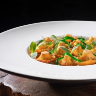 Risotto is prepared in the most classic way: using Arborio rice with white wine and constant stirring. Chanterelles are added in two stages. First, they are mixed into the simmering rice in broth to impart a forest aroma, then sautéed separately and placed on top as a garnish. But the main trick that Chef John Smith, from a popular American restaurant, saves for last is decorating the finished risotto with a delicate spiral of dill gelée. This decoration looks fantastic, and if you really want to replicate it at home, there's nothing impossible in the technique; you just need to prepare a pastry syringe in advance and a dish with ice to ensure the spirals set instantly.