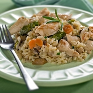 Melt 65 grams of butter in another pot, add the onion and chicken, and cook over low heat, stirring, for 10 minutes, until the chicken is golden brown. Season with salt and pepper, and add the wine. Cook for 12–15 minutes, until the liquid has evaporated.
