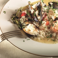 Once the broth comes to a boil, reduce the heat and simmer, stirring constantly and adding broth as it evaporates. Along with one of the additions of broth, add a shot of martini. When the rice is almost ready, season it with salt.