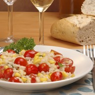 Add the tomatoes, corn, and sun-dried tomatoes, mix, bring to a boil, and transfer to a preheated dish. Place in the oven preheated to 356°F for 35 minutes.