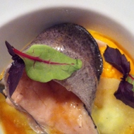 On a plate, spread the carrot purée, place the trout fillet in the center, and arrange the apple ravioli around it.
