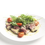 Slice the roast beef thinly and arrange it on a plate, drizzle with sauce, garnish with halved cherry tomatoes, and sprinkle with cheese.