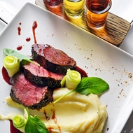 Trim the tenderloin of any sinews and membranes, then coat it in a mixture of salt, pepper, coarsely chopped garlic, thyme, and rosemary. Add olive oil and balsamic glaze, and mix well. Marinate for 30 minutes.