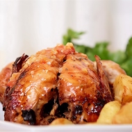 Place a sprig of rosemary, garlic, and balsamic vinegar inside the chicken. Generously season with salt and pepper. Tie the legs together.