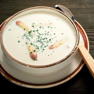 In a blender, place one-third of the asparagus and pour in 2 cups of broth. Blend and transfer to a pot. Repeat this process 2 more times. Gently heat the soup and add more broth if necessary. Season with salt and pepper.