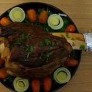 Clean the shank and sear it until a golden crust forms, so that the juices do not escape during cooking. Alternatively, you can char it with a gas torch.