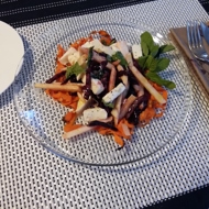 Cut the apples into strips. Cut the cheese into random pieces of 1–2 cm. Mix 2/3 of the apples, cheese, and beets, drizzling with white wine vinegar and olive oil, and sprinkle with basil and mint.
