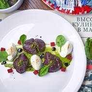 Spread 25 grams of pesto mousse on a plate. Top with ricotta cheese and 95 grams of glazed beet. Garnish with ground pistachios, pickled apples, baby spinach, and a drizzle of balsamic cream.
