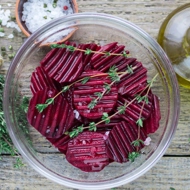 Add the beetroot and garlic to the dressing. Ensure the beetroot is fully coated in the marinade.