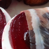 Carefully wrap the beet Napoleon with bacon — sprinkle with salt and freshly ground pepper on top.