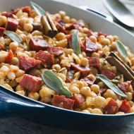 Melt the butter in a skillet, add the onion, and cook over low heat, stirring, for 5 minutes until it becomes soft and translucent. Add the tomatoes and cook for another 10 minutes, crushing them with a spatula. Stir in the paprika and chorizo, then remove the skillet from the heat.