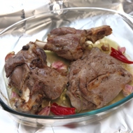 Peel the burnt skin off the chili and garlic, mix the flesh together — this creates a wonderful spicy paste for the meat.