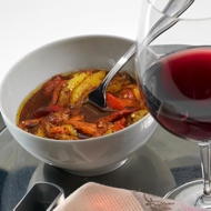 Remove the roasted peppers from the oven and let them cool until they can be sliced into thick noodles. Cut the peppers into noodle-like strips and mix them with olive oil, sherry vinegar, finely chopped parsley, crushed garlic, and whole leaves of green basil. Season with salt and pepper, mix again, let it sit for a while, and serve. It pairs well with crispy croutons sautéed in vegetable oil.